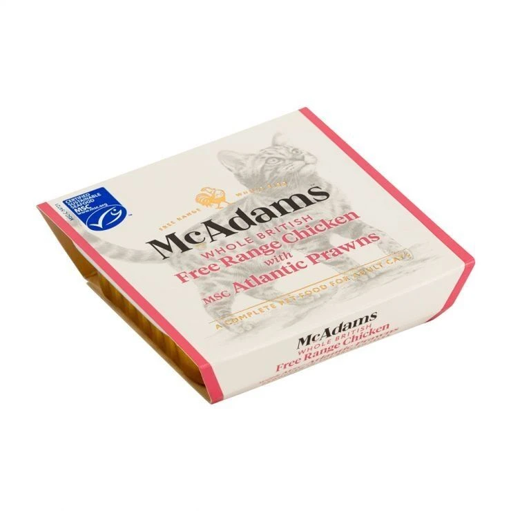 McAdams Whole Chicken is a natural grain free wet diet that’s made from the highest quality and most ethically sourced meat; Whole British Free-Range Chicken and MSC certified Alaskan Prawns. This all life stage diet is designed to be incredibly palatable for cats but also to perfectly suit their digestive systems.