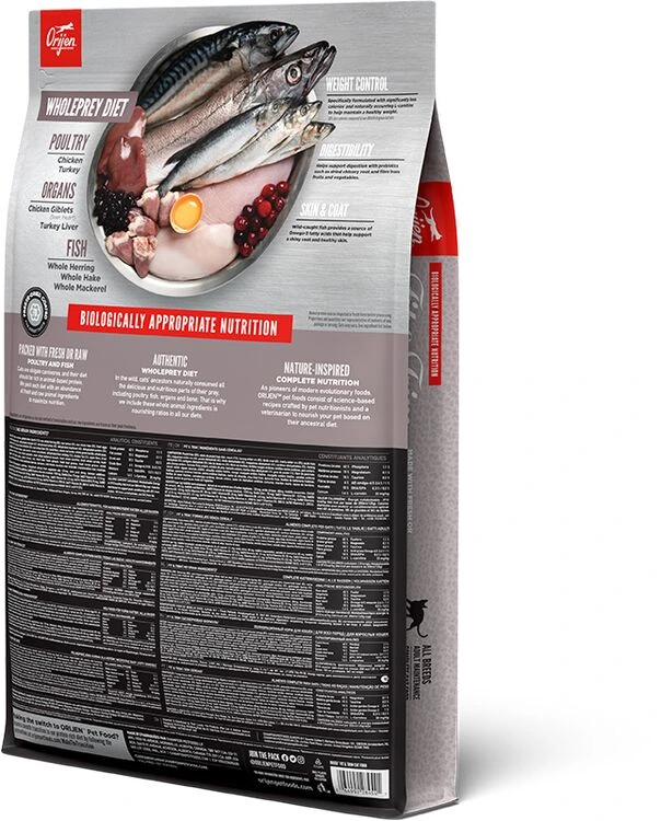 Ingredients: Fresh chicken (20%), fresh chicken giblets (liver, heart) (11%), raw whole herring (8%), raw turkey (6%), raw whole hake (5%), fresh eggs (5%), raw whole mackerel (4%), dehydrated chicken (4%), dehydrated turkey (4%), dehydrated mackerel (4%), dehydrated sardine (3%), dehydrated herring (3%), dehydrated whitefish (3%), raw turkey liver (3%), lentil fibre, whole red lentils, whole green lentils, whole peas, whole chickpeas, whole pinto beans, pea starch, whole navy beans, dehydrated blue whiting (1%), chicken fat (1%), apple fibre, dried kelp, algae (source of DHA), fresh whole pumpkin, fresh whole butternut squash, fresh whole zucchini, fresh whole carrots, fresh whole apples, fresh whole pears, dried chicory root, fresh kale, fresh spinach, fresh beet greens, fresh turnip greens, whole cranberries, whole blueberries, whole saskatoon berries, turmeric, milk thistle, burdock root, lavender, marshmallow root, rosehips.