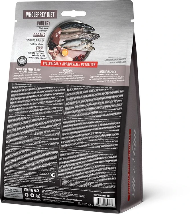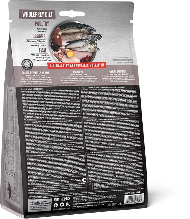 Orijen Fit & Trim Dry Cat Food is rich in protein and is wonderfully delicious, perfect for promoting peak body conditioning and to help overweight cats stay healthy. It will help to support lean muscle mass and contains fresh chicken, turkey and fish.Â